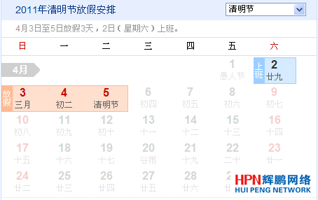根據《國務院辦公廳關于2011年部分節假日安排的通知》(國辦發明電〔2010〕40號)精神,4月3日至5日放假調休,共3天。4月2日(星期六)上班。放假期間,請各部門做好安全檢查。