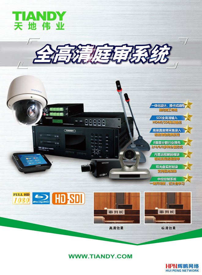 天津天地偉業數碼科技有限公司 “數字化庭審系統”通過加強計算機技術、圖像數字化技術和信息技術的應用采用先進的語音激勵畫面自動切換、專業的MPEG-4/H.264數字音視頻編碼并能夠實時DVD光盤直錄、音像資料庫硬盤備份、網絡點播、動態片頭字幕疊加、嵌入式操作軟件、音視頻參數調整、“雙碼流”網絡傳輸直播技術。實現法院系統對審判的標準化建設,利用現有的網絡對審判過程進行有效的監督和管理,貫徹科技法庭應用理念,提高了審判過程的真實性、有效性和公平性,加強了法院在辦案、辦公管理的信息化程度。