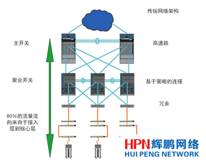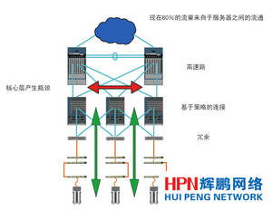 傳統的企業網絡通常由三個層次組成:服務器連接到接入層,再經匯聚層,最后到基于策略的連接和高速路由核心層。80%的流量流向來自于接入層到核心層,與在網絡上只有20%流向是來自于冗余和備份(如圖所示)。