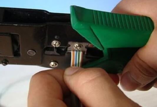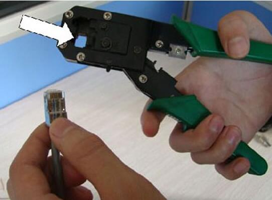 第六步 :壓線操作。確認無誤之后就可以把水晶頭插入網線鉗的8P槽內壓線了,把水晶頭插入后,用力握緊線鉗,把水晶頭凸出在外面的針腳全部壓入水晶并頭內,受力之后聽到輕微的“啪”一聲即可。