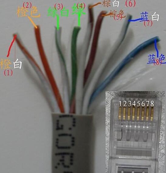 第五步 :線纜插入水晶頭內。將雙絞線的每一根線依序放入RJ-45水晶頭的引腳內,第一只引腳內應該放白橙色的線,其余類推。