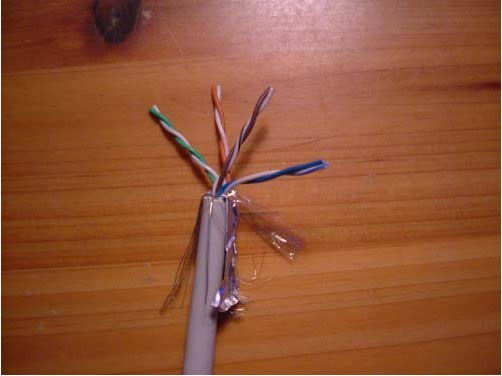 第一步:用剝線工具或壓線鉗的刀具在離線頭10厘米長左右(也可以長一點,方便后面壓線)將雙絞線的外包皮剝去。露出了四對雙絞線。