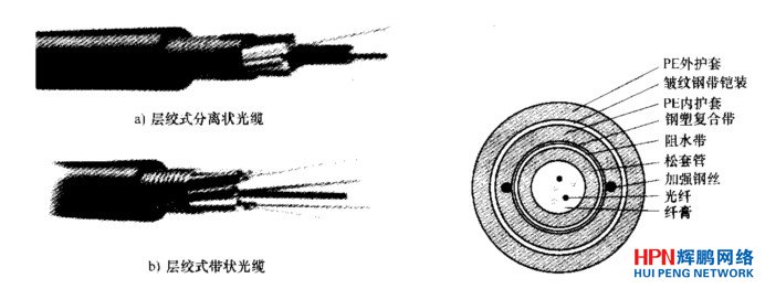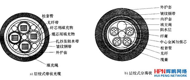 室外光纜的基本結構有層絞式、中心管式、骨架式。每種基本結構中既可放置分離光纖,亦可放置帶狀光纖。其特點分述如下:松套管,無絞合直接放在纜的中心位置,縱包阻水帶和雙面涂塑鋼(鋁)帶,兩根平行加強圓磷化碳鋼絲或玻璃鋼圓棒位于聚乙烯護層中。按松套管中放入的是分離光纖、光纖束還是光纖帶,中心管式光纜分為分離光纖的中心管式光纜或光纖帶中心管式光纜等。
