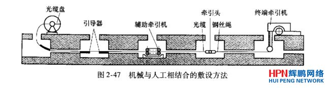 (2)光纜管道敷設方法光纜的管道敷設方法主要有機械牽引法、人工牽引法,以及機械與人工相結合的敷設方法。