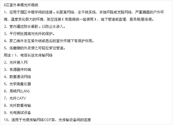 傳輸方面6芯光纜主要是以單模和多模兩種規格。單模(內徑是9μm外徑是125μm)多模(有兩種,分別是內徑是62.5μm外徑是125μm和內徑是50μm外徑是125μm),單模是一種長距離傳輸的模式,波長是1310和1550兩種;多模是一種短距離傳輸的模式(傳輸距離限制在2000米以內),波長是850和1300兩種。(現在廣泛應用的是單模,而多模正在逐漸的淘汰中)